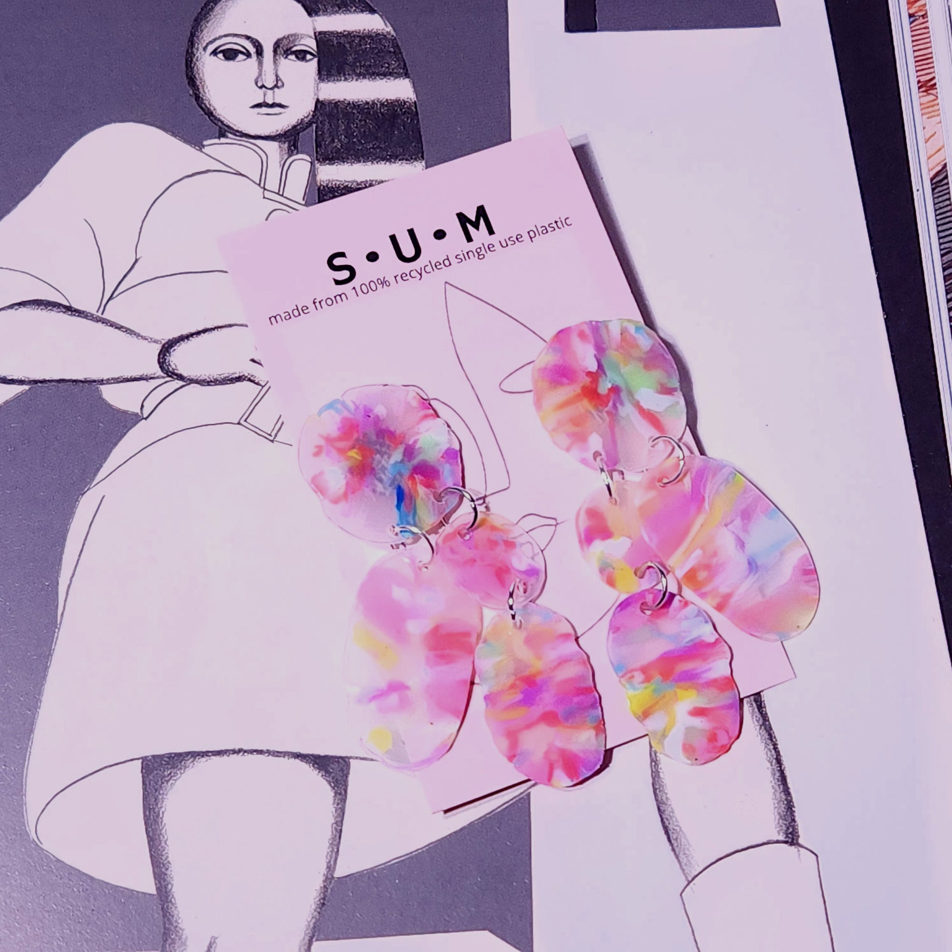 S.U.M. earrings are made by Jess in the Macedon Ranges, Victoria. She melts down all sorts of single-use plastics – milk cartons, straws, plastic lids, shampoo bottles, formula lids, dish-washing liquid containers – and uses the repurposed plastic like paint. As she says, there is a multiverse of useful, beautiful things that these throw-away plastics can become.