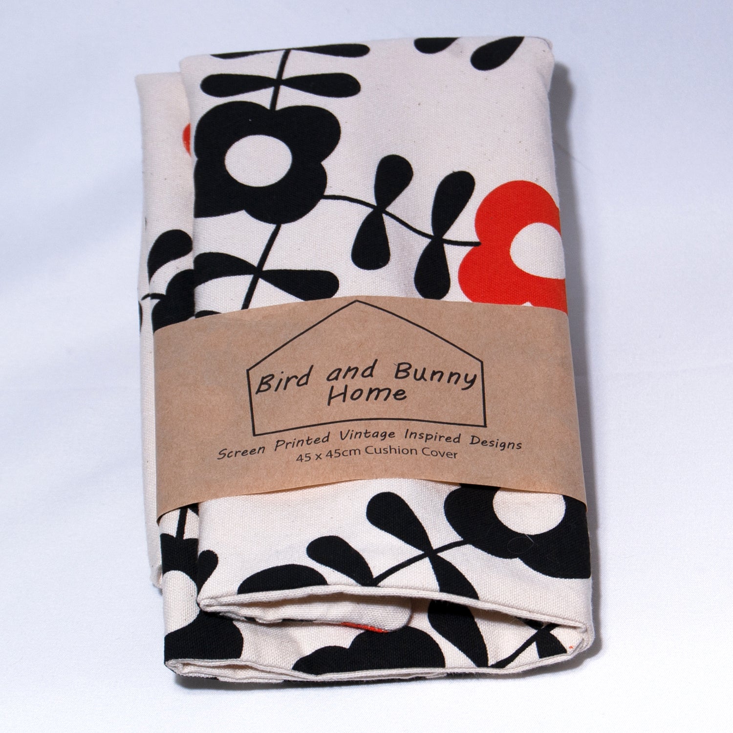 These vintage inspired cushion covers in orange and black are printed with an original design by Brigitta Altschwager. The striking floral pattern is screen printed by hand on cotton fabric woven in Australia, using ink that is also manufactured locally.