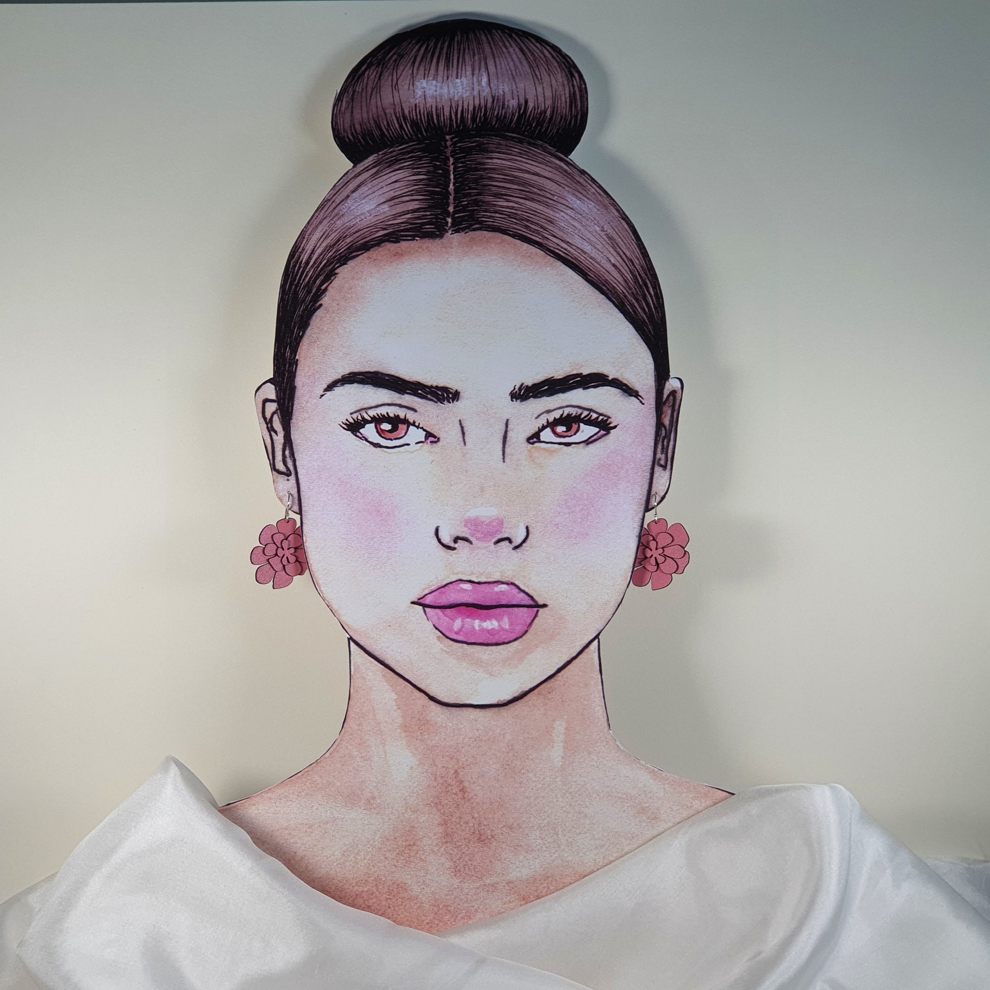 The mannequin photo shows the scale of the earrings on a life-size face.
