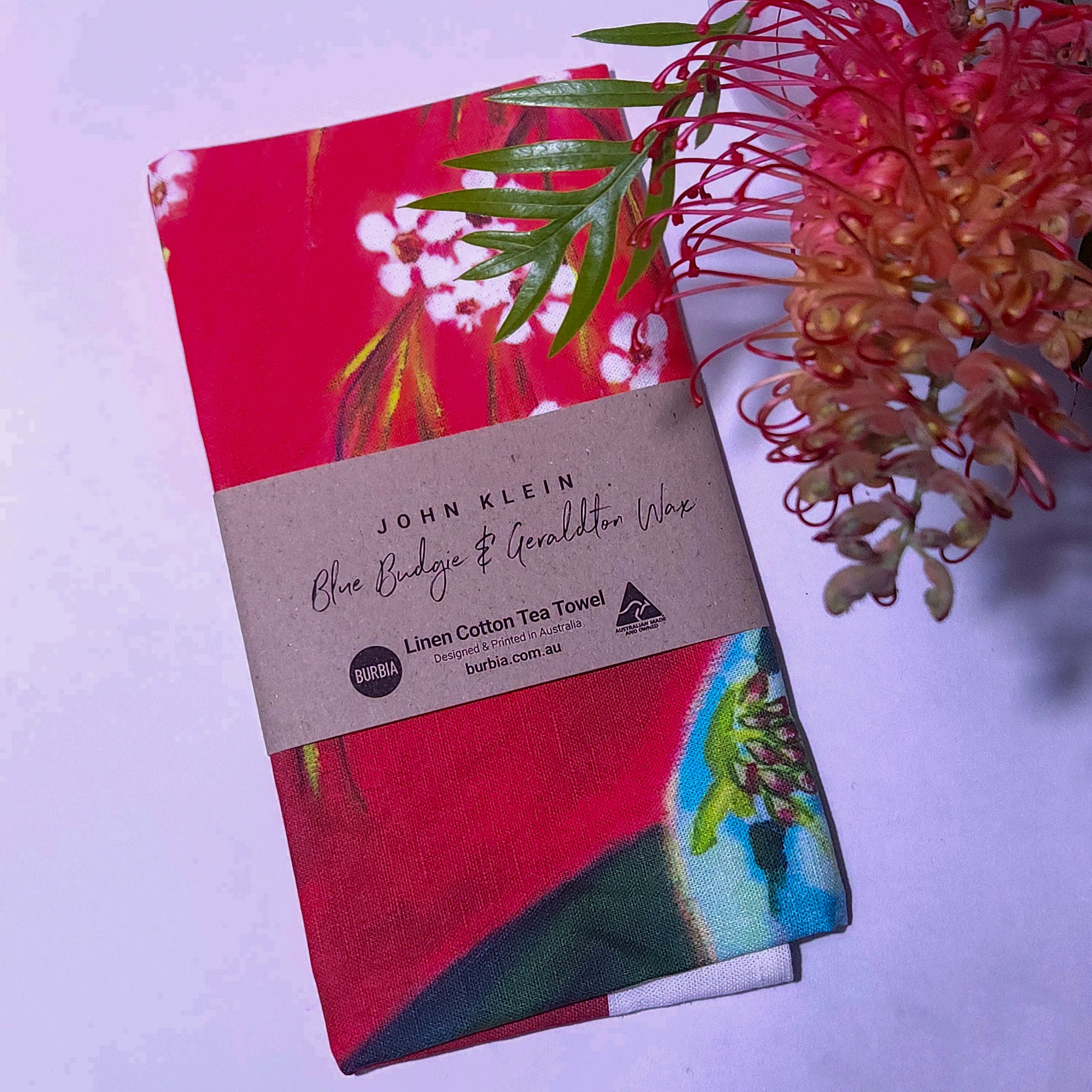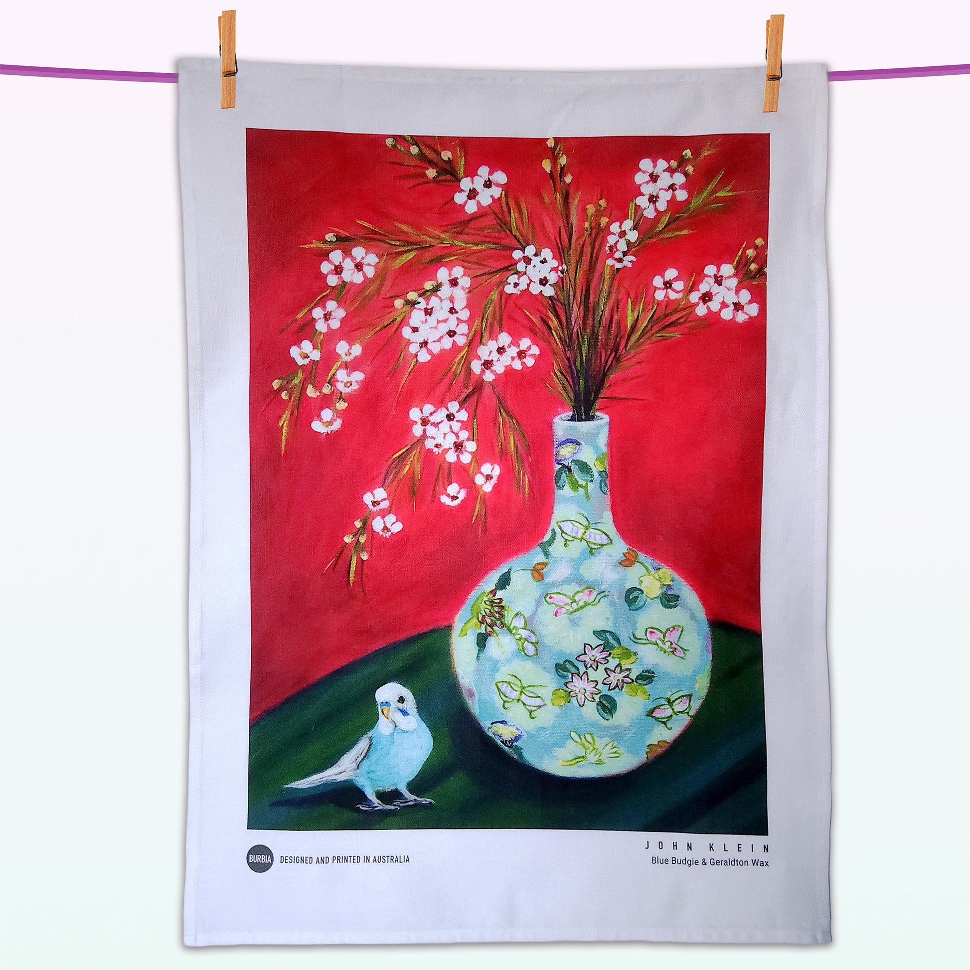 Culinary meets culture in this one-of-a-kind tea towel featuring Australian artist John Klein's vivid Blue Budgie and Geraldton Wax painting. A testament to contemporary Australian design, each tea towel is expertly printed by Burbia to capture the incredible detail in the artwork.