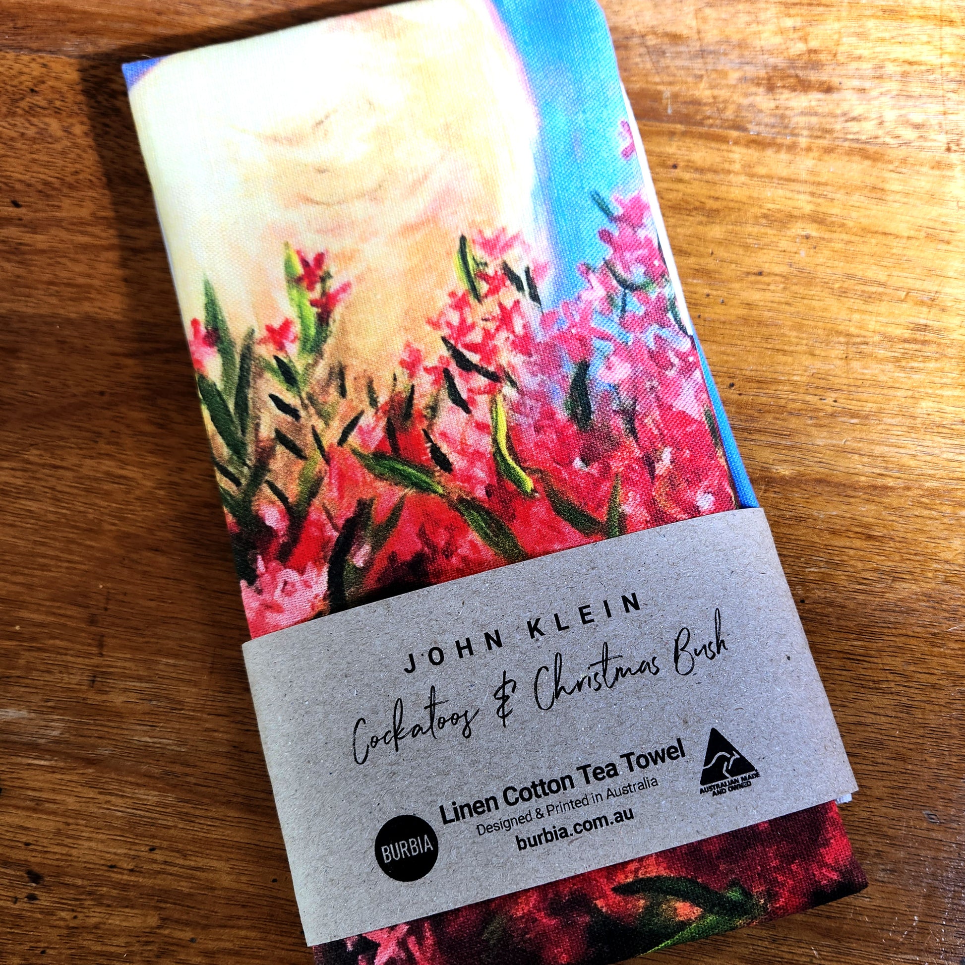 Bring the beauty of Australia's native flora into your home with this limited-edition tea towel, featuring John Klein's exquisite painting of two sulphur-crested cockatoos nestled among a red Christmas bush. The gorgeous colours capture the spirit of the glorious birds that share our space. Perfectly apt for the festive season or any time of the year.