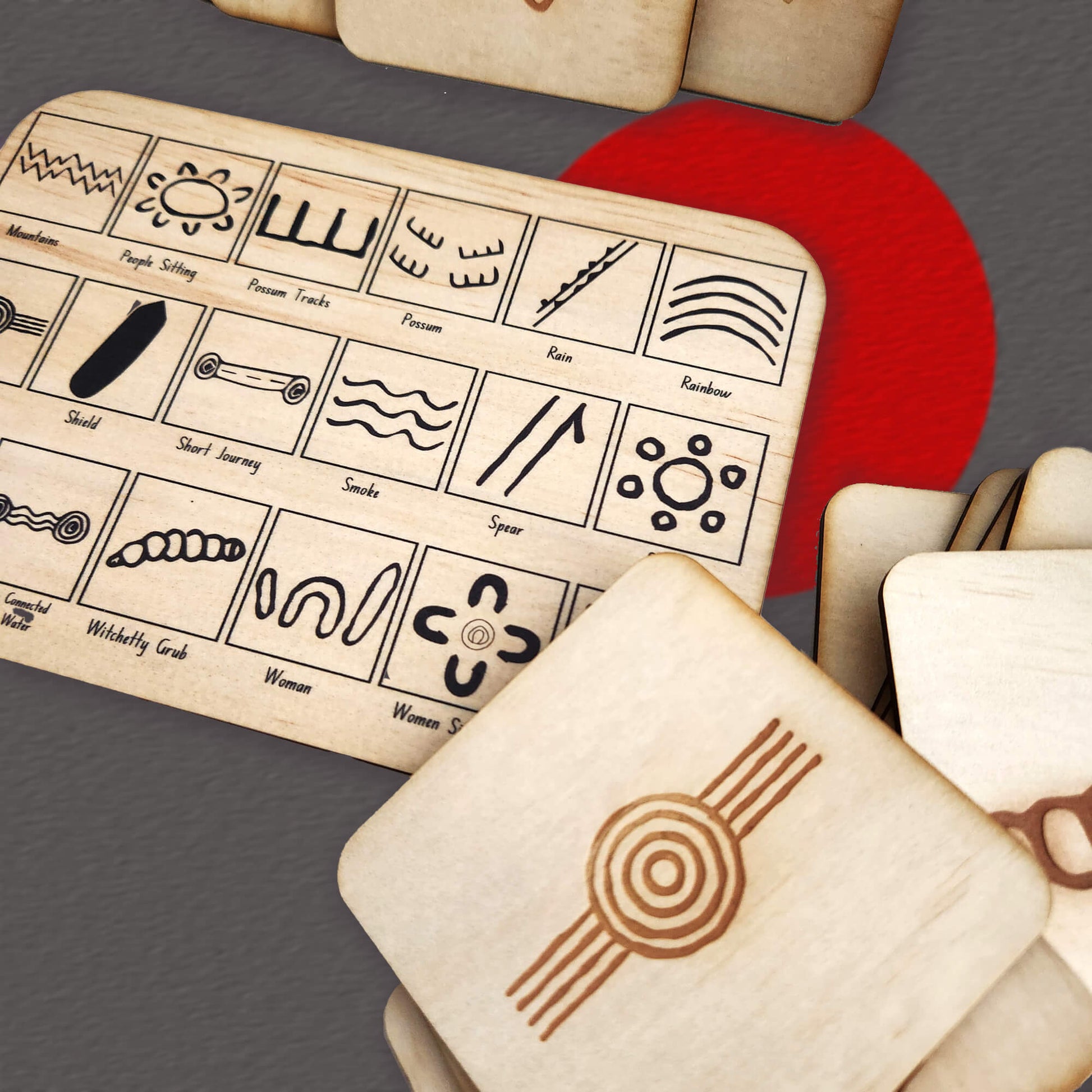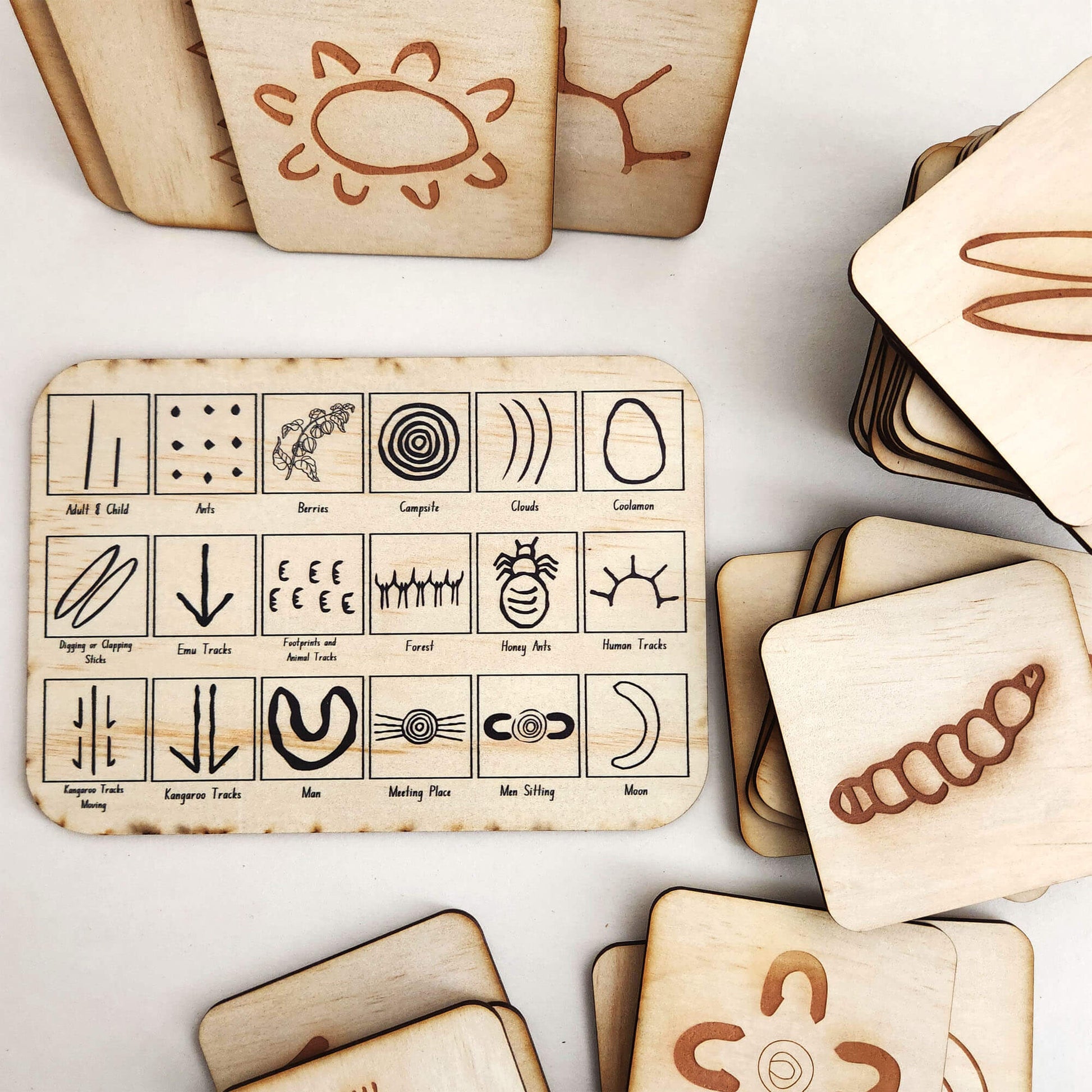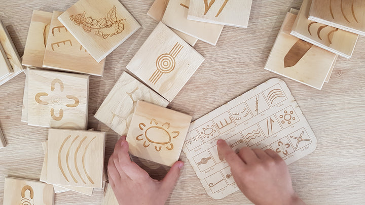 The 36 piece set consists of tiles engraved with Indigenous symbols used by First Nations people to illustrate their Dreaming stories and record information. Imagine how these symbols might mark a sacred site, or give directions to the location of a waterhole.