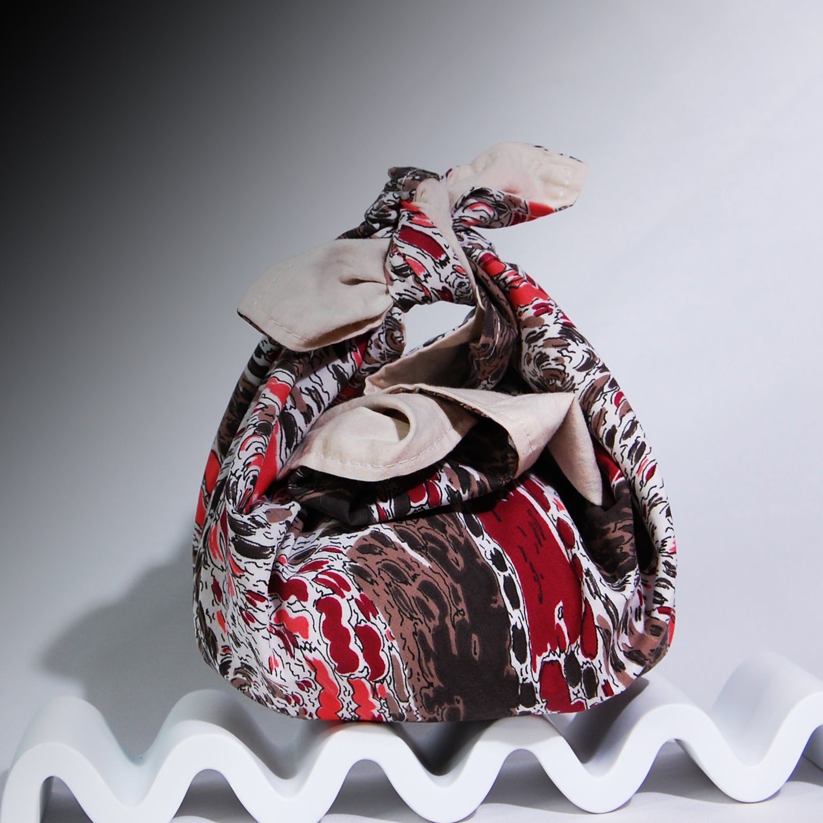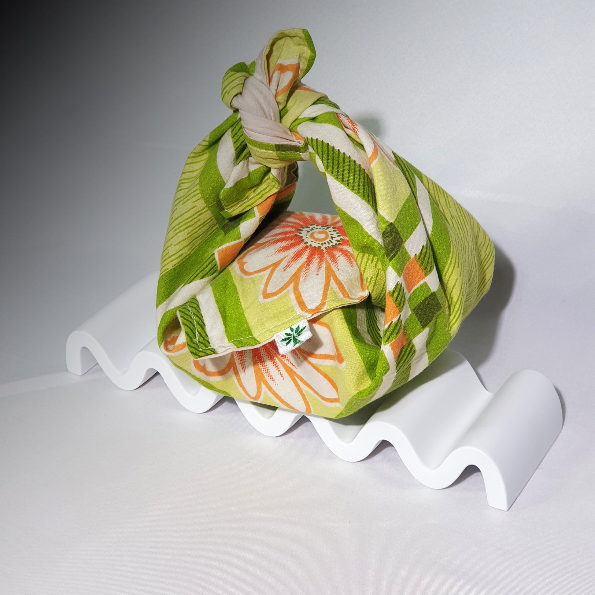 Furoshiki are square pieces of cloth used in Japan to quickly and easily wrap and carry goods. The term furoshiki is believed to have originated in the 14th Century when people used them to wrap their kimonos at the bathhouse. The custom soon spread and they became indispensible as wrapping for gifts and merchandise.