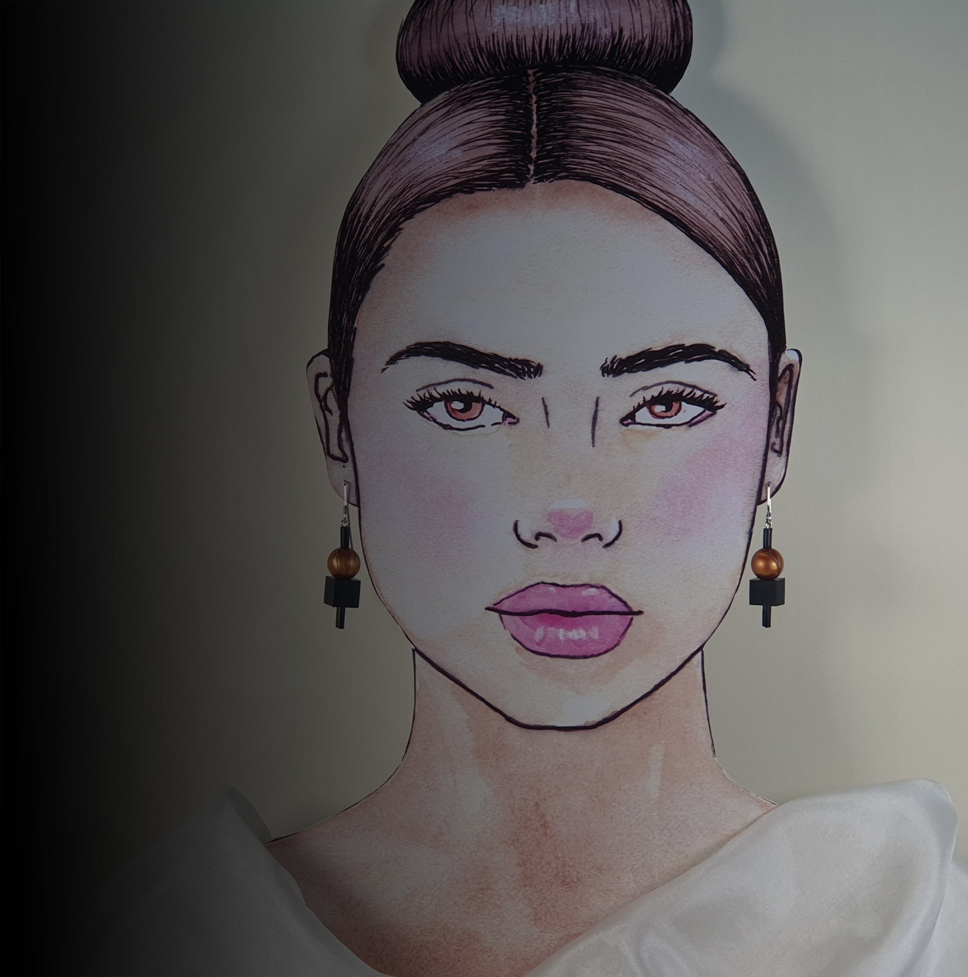 The mannequin photo shows the scale of the earrings on a life-size person.