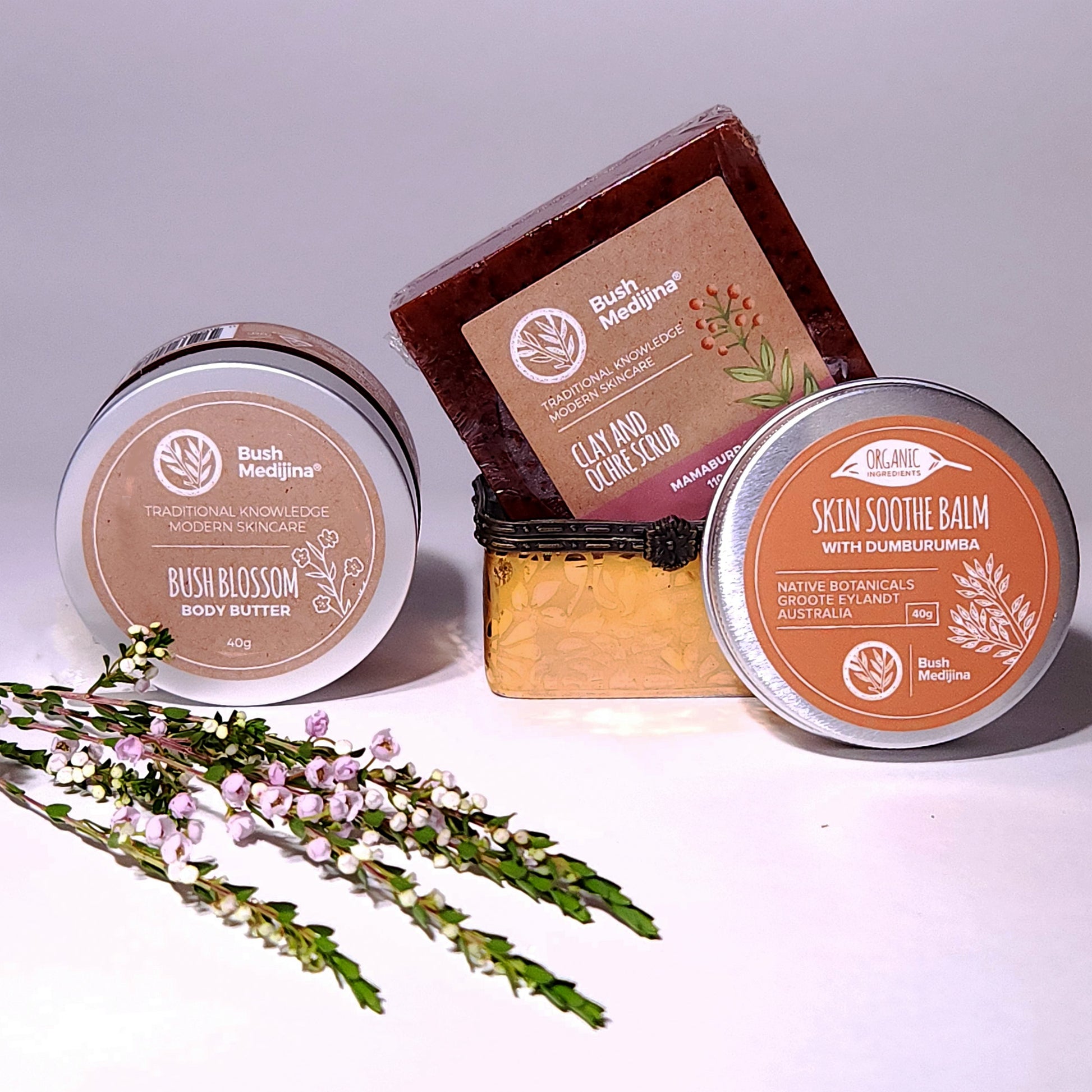 The best combination for keeping skin smooth and looking good. Start with the Clay and Ochre scrub, followed by the Bush Blossom body butter and finish off with Skin Soothe Balm for extra nourishment.