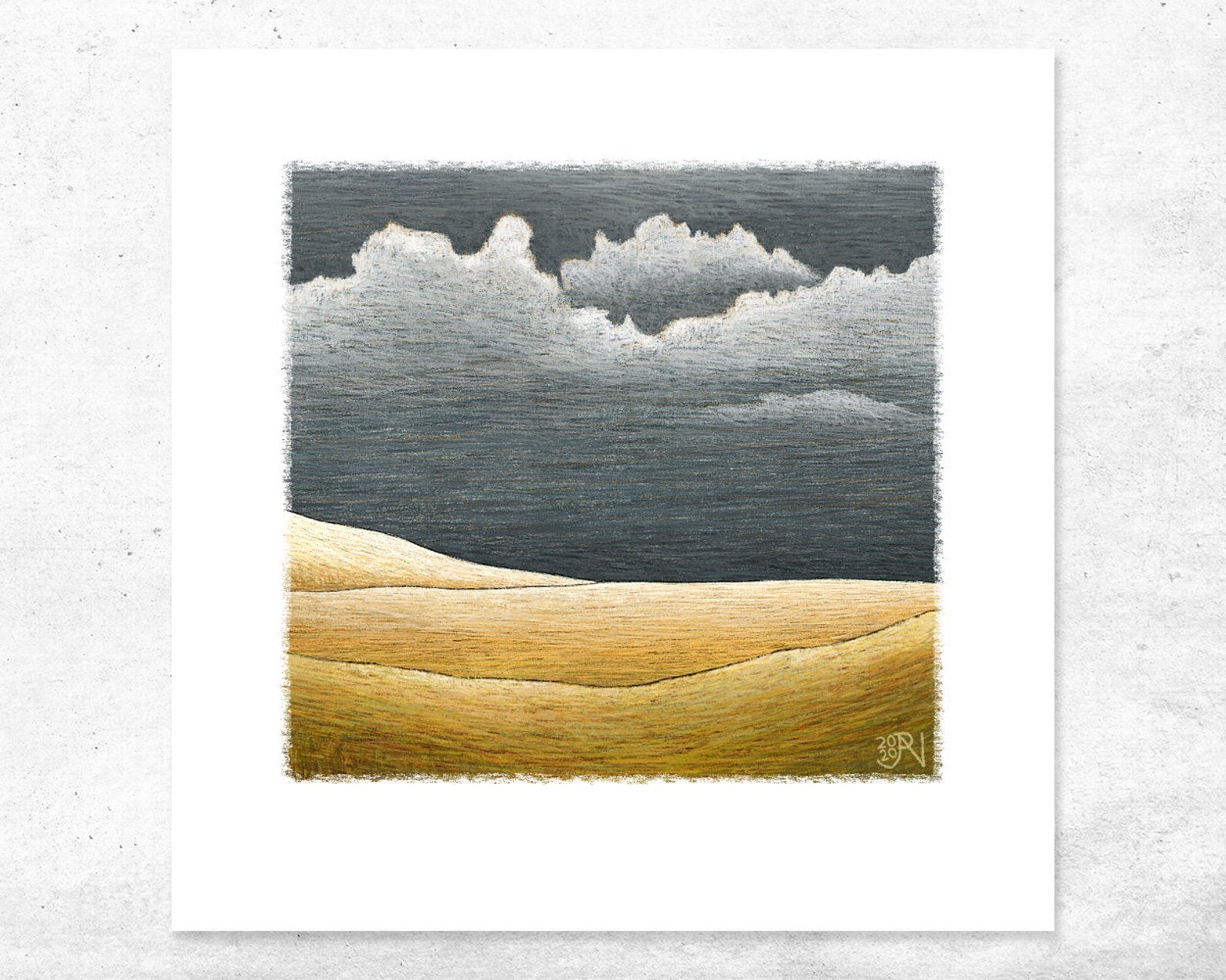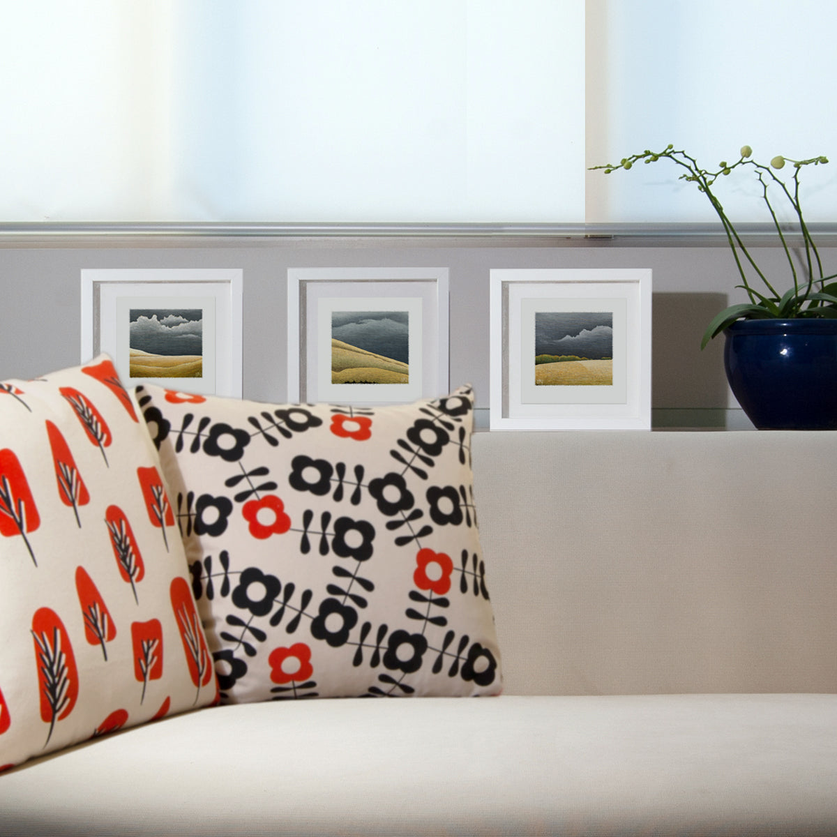 Three tiny art prints depict storms approaching the Australian landscape - climate change in action and something we can all relate to.