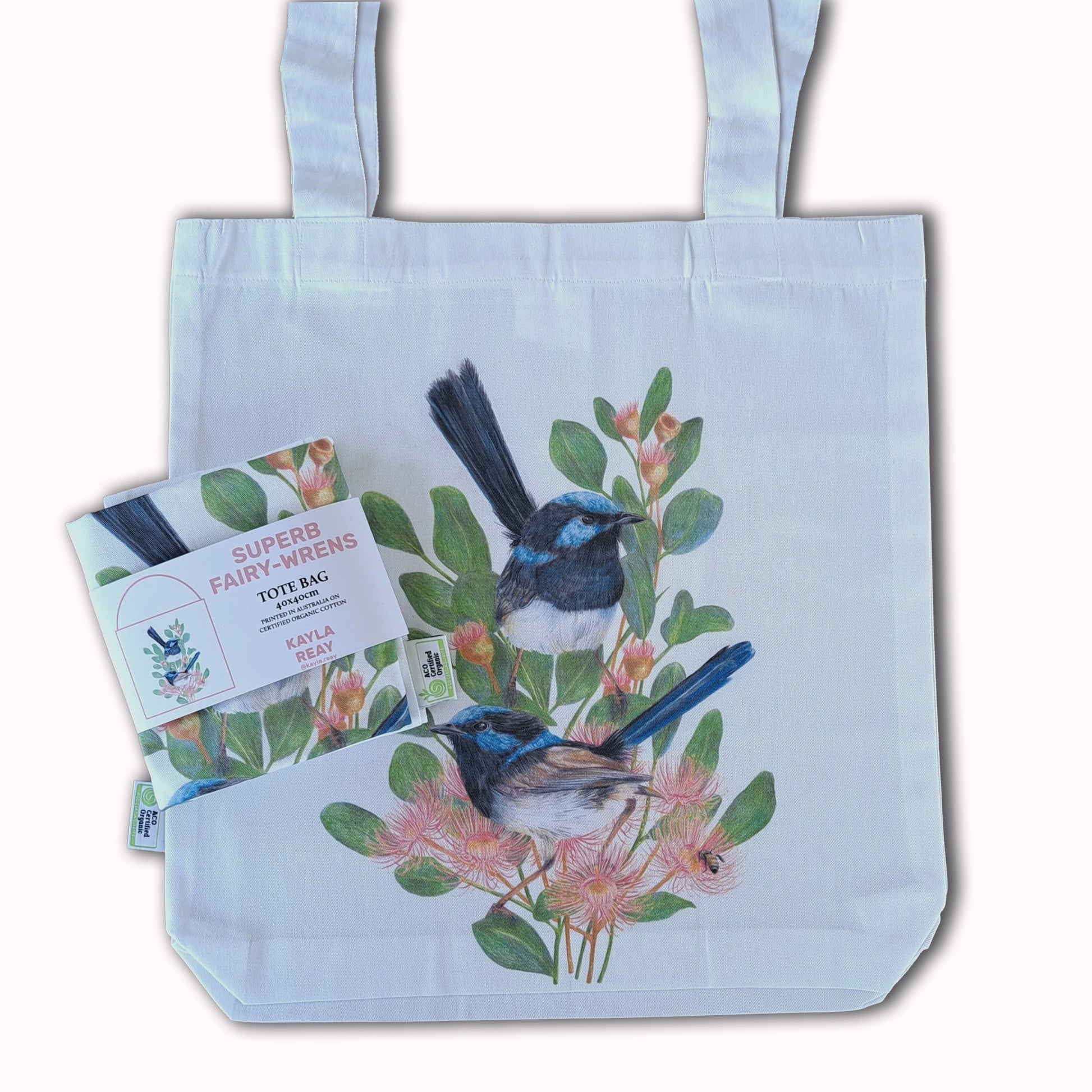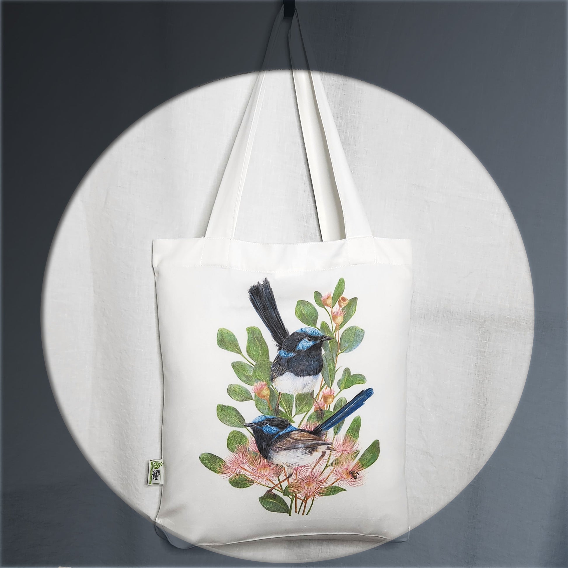 Add a stylish touch of nature to your everyday carry with this superb fairywren organic cotton tote bag by Australian artist Kayla Reay. This reusable tote features one of Reay's original illustrations inspired by her nature walks along the NSW coast.